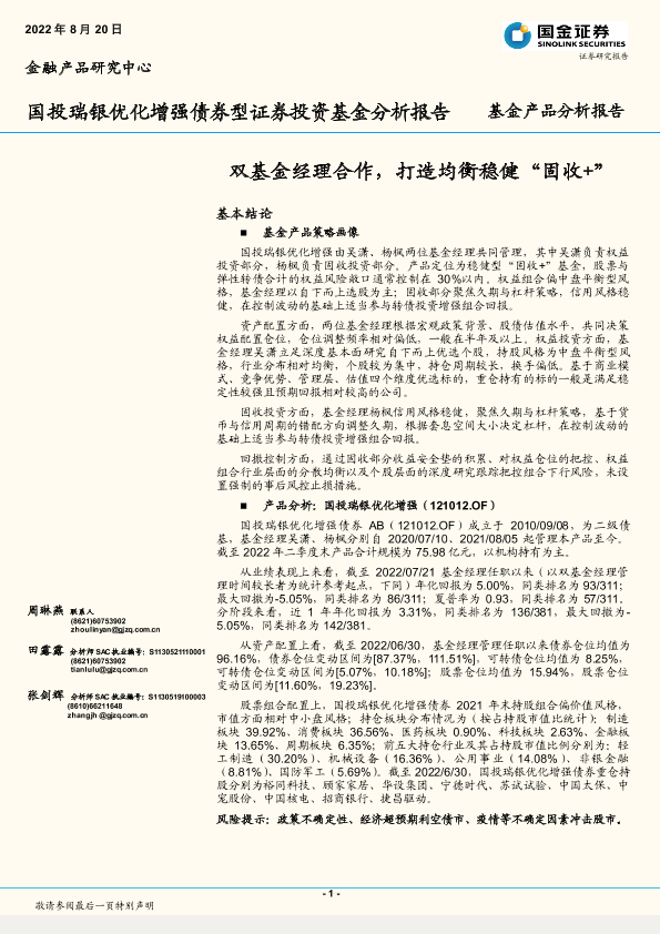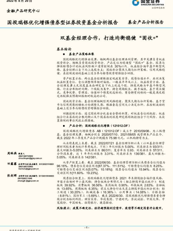 【国金证券】【20220820】国投瑞银优化增强债券型证券投资基金分析报告:双基金经理合作,打造均衡稳健“固收+”-16页