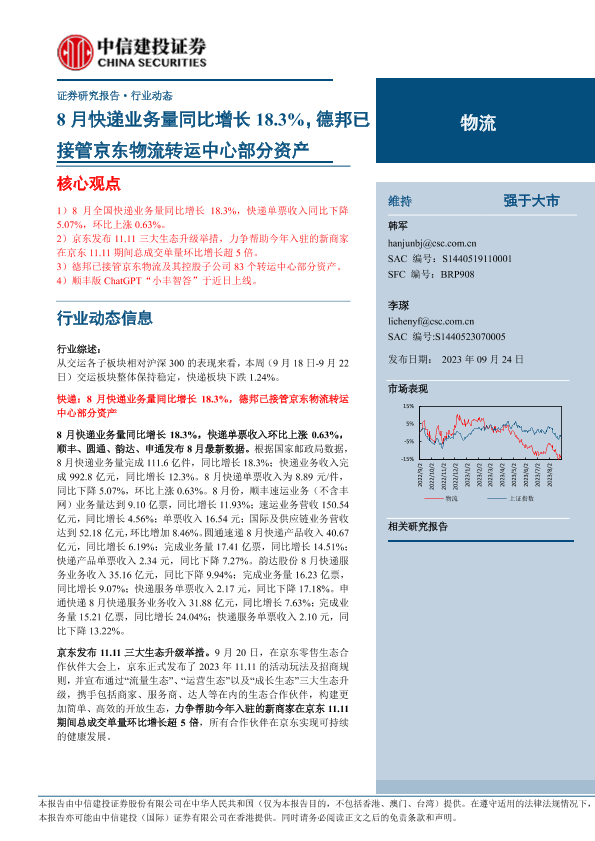 【中信建投证券】【20230924】物流行业:8月快递业务量同比增长18.3%,德邦已接管京东物流转运中心部分资产-24页