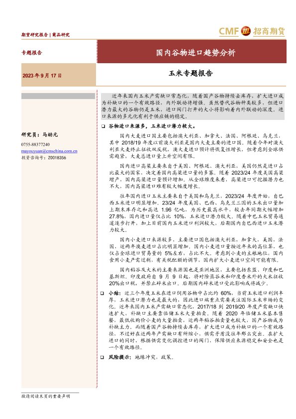 【招商期货】【20230917】玉米专题报告:国内谷物进口趋势分析-18页