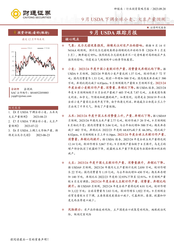 【财通证券】【20230920】种植行业9月USDA跟踪月报:9月USDA下调全球小麦、大豆产量预测-15页