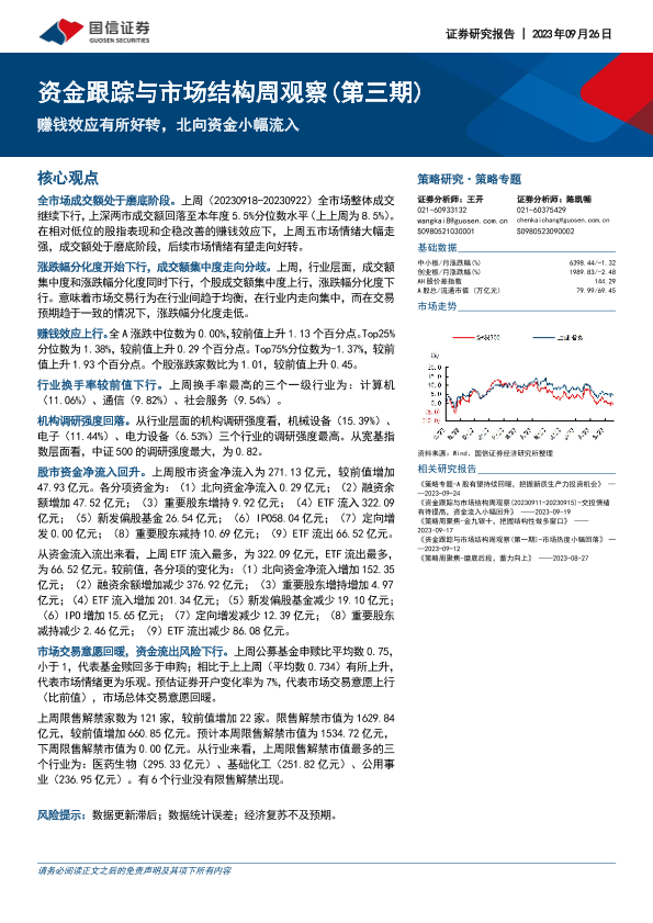 【国信证券】【20230926】资金跟踪与市场结构周观察(第三期):赚钱效应有所好转,北向资金小幅流入-26页
