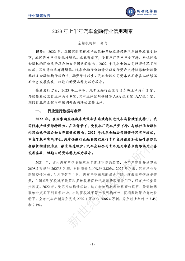 【新世纪评级】【2023】2023年上半年汽车金融行业信用观察-10页
