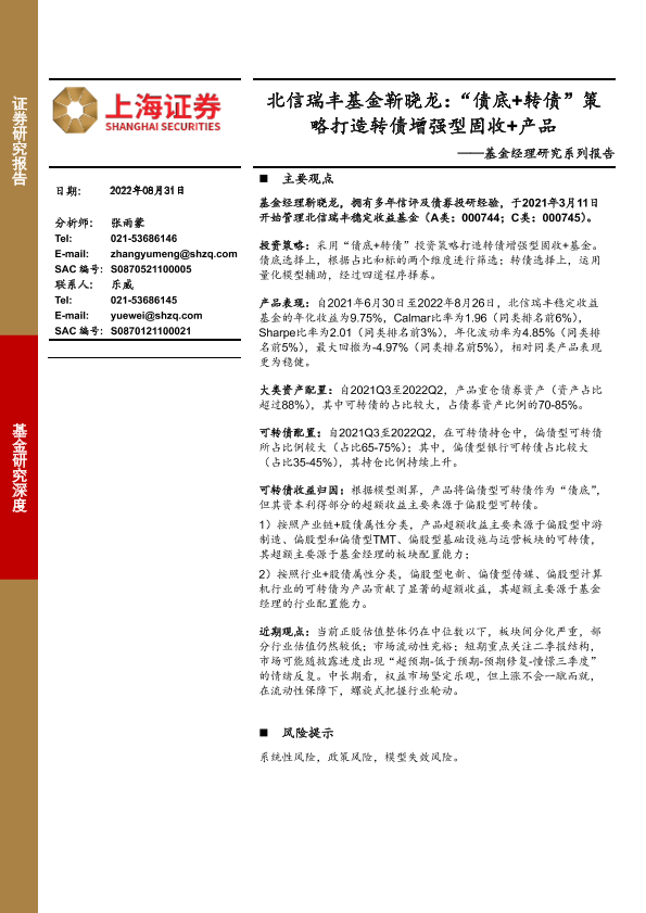 【上海证券】【20220831】基金经理研究系列报告:北信瑞丰基金靳晓龙,“债底+转债”策略打造转债增强型固收+产品-16页
