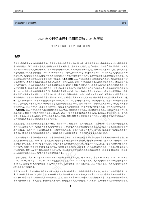 新世纪评级 交通运输仓储邮政 2023年 PDF 1.9 MB