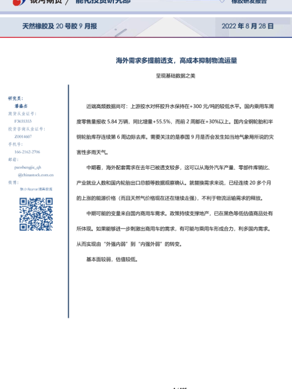 【银河期货】【20220828】天然橡胶及20号胶9月报:海外需求多提前透支,高成本抑制物流运量-105页