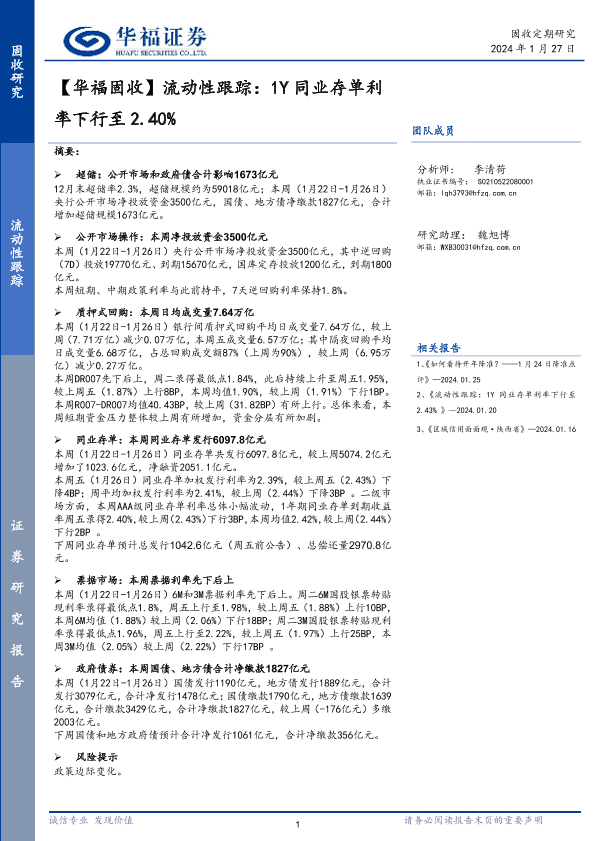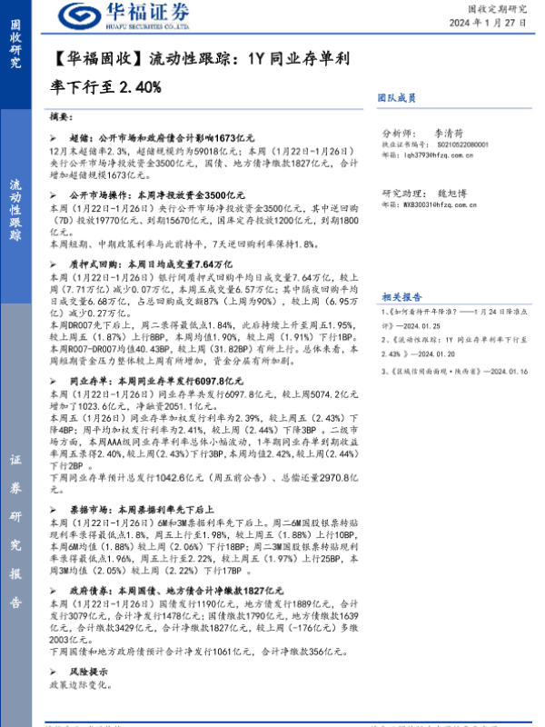【华福证券】【20240127】【华福固收】流动性跟踪:1Y同业存单利率下行至2.40%-12页