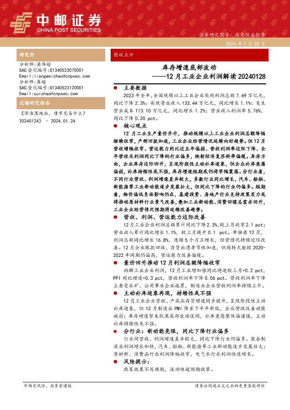 【中邮证券】【20240128】12月工业企业利润解读:库存增速底部波动-12页