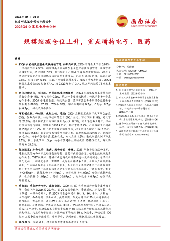 【西南证券】【20240129】2023Q4公募基金持仓分析:规模缩减仓位上升,重点增持电子、医药-20页