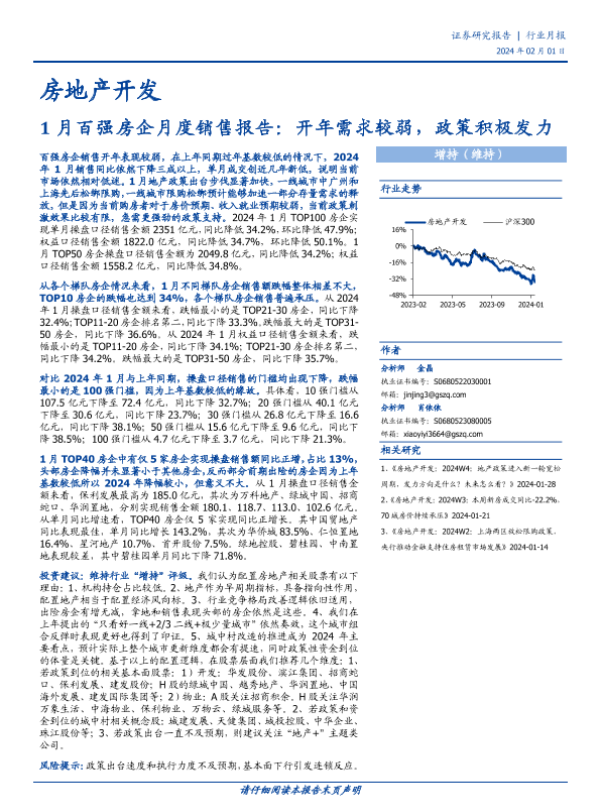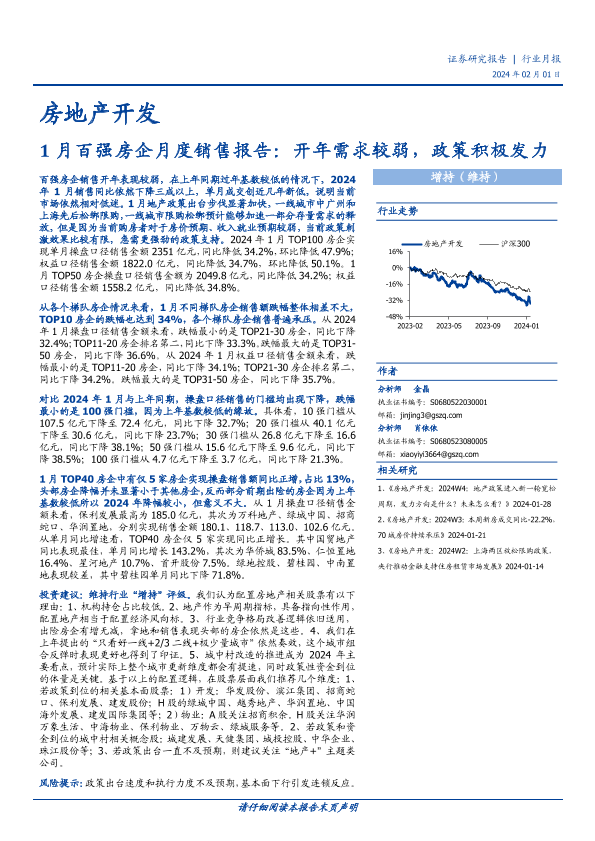 【国盛证券】【20240201】房地产开发行业1月百强房企月度销售报告:开年需求较弱,政策积极发力-10页