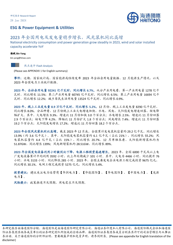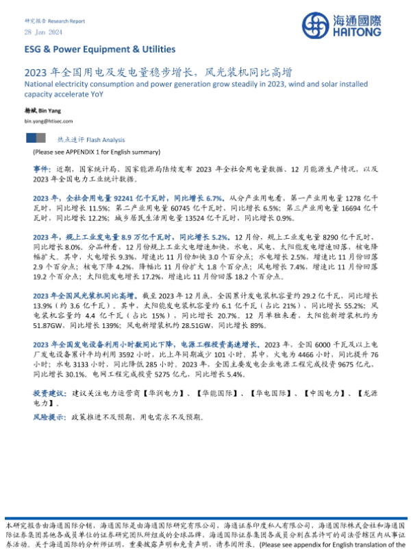 【海通国际】【20240128】2023年全国用电及发电量稳步增长,风光装机同比高增-10页