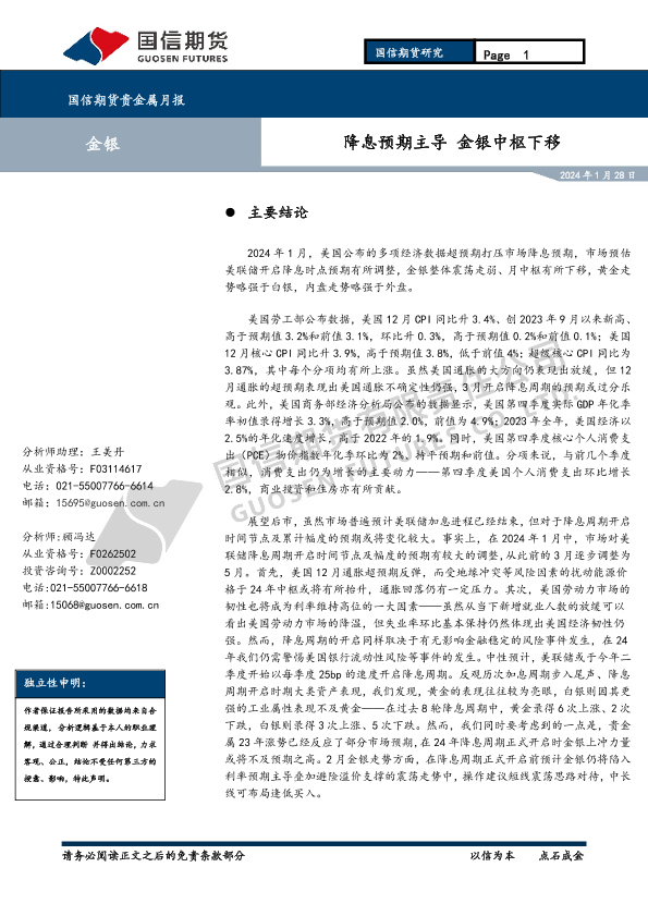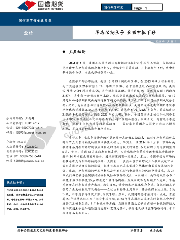 【国信期货】【20240128】贵金属月报:降息预期主导 金银中枢下移-14页