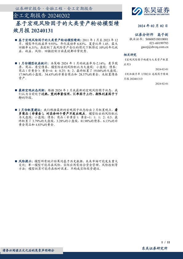 【东吴证券】【20240202】金工定期报告:基于宏观风险因子的大类资产轮动模型绩效月报-11页