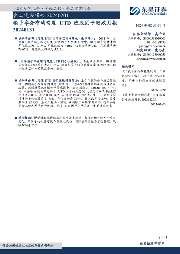【东吴证券】【20240201】金工定期报告:换手率分布均匀度UTD选股因子绩效月报-13页