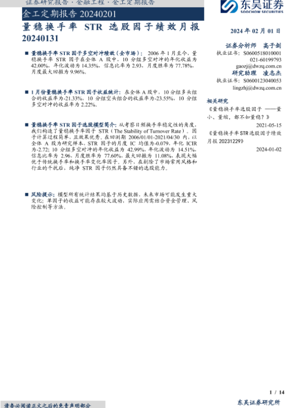 【东吴证券】【20240201】金工定期报告:量稳换手率STR选股因子绩效月报-14页