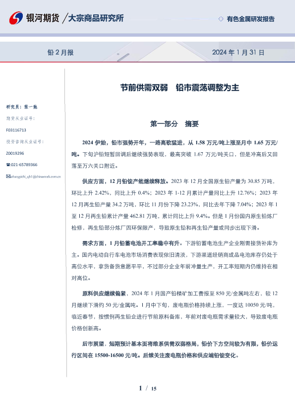【银河期货】【20240131】铅2月报:节前供需双弱 铅市震荡调整为主-15页