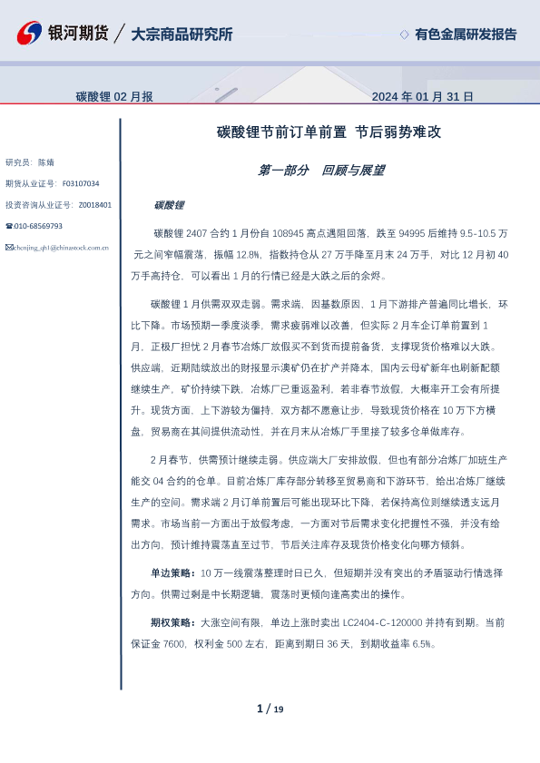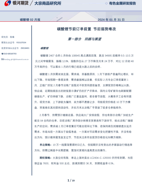【银河期货】【20240131】碳酸锂02月报:碳酸锂节前订单前置 节后弱势难改-19页