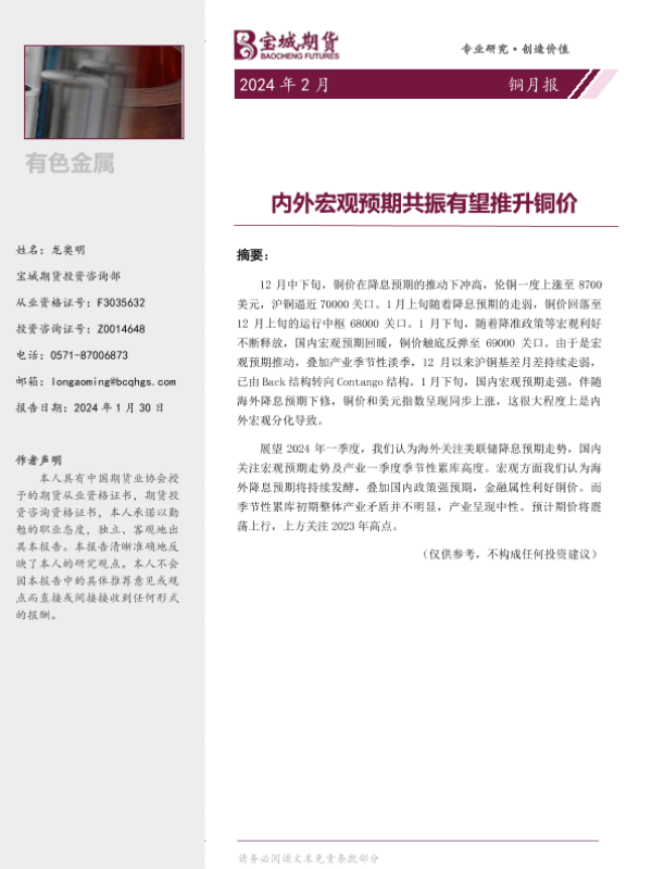 【宝城期货】【20240130】铜月报:内外宏观预期共振有望推升铜价-20页