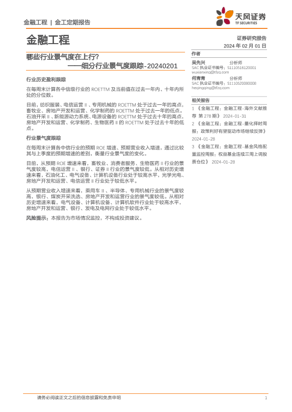 【天风证券】【20240201】细分行业景气度跟踪:哪些行业景气度在上行?-11页