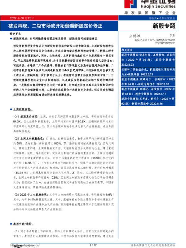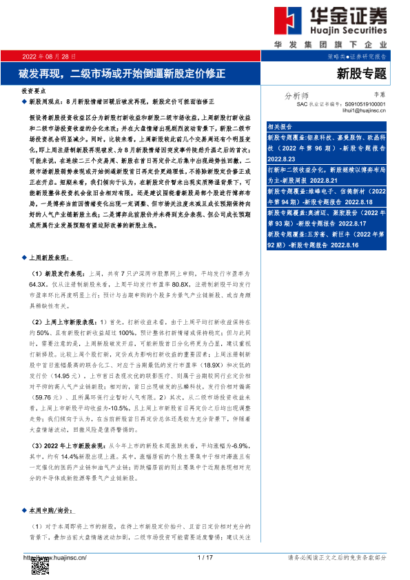 【华金证券】【20220828】新股专题:破发再现,二级市场或开始倒逼新股定价修正-17页
