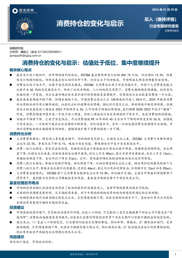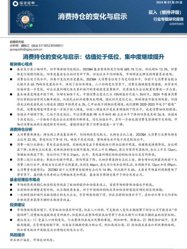 【国金证券】【20240129】消费持仓的变化与启示:估值处于低位,集中度继续提升-38页