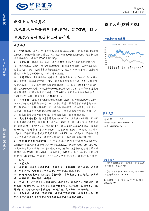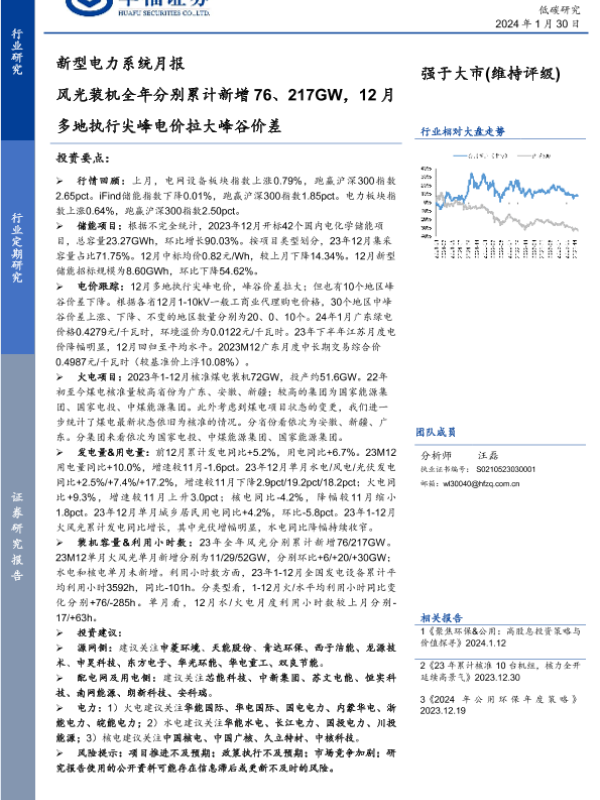 【华福证券】【20240130】新型电力系统月报:风光装机全年分别累计新增76、217GW,12月多地执行尖峰电价拉大峰谷价差-26页