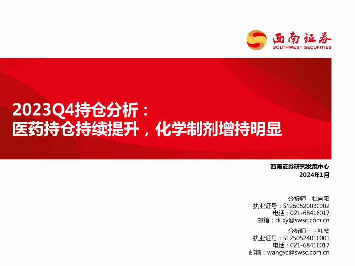 2023Q4 化学制剂 医药持仓 增持趋势 西南证券
