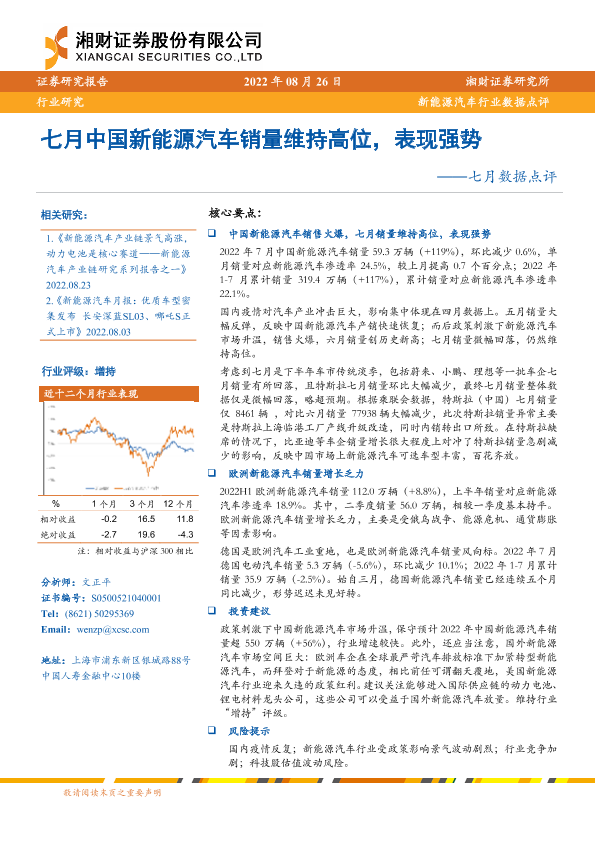 【湘财证券】【20220826】新能源汽车行业数据点评:七月数据点评,七月中国新能源汽车销量维持高位,表现强势-15页