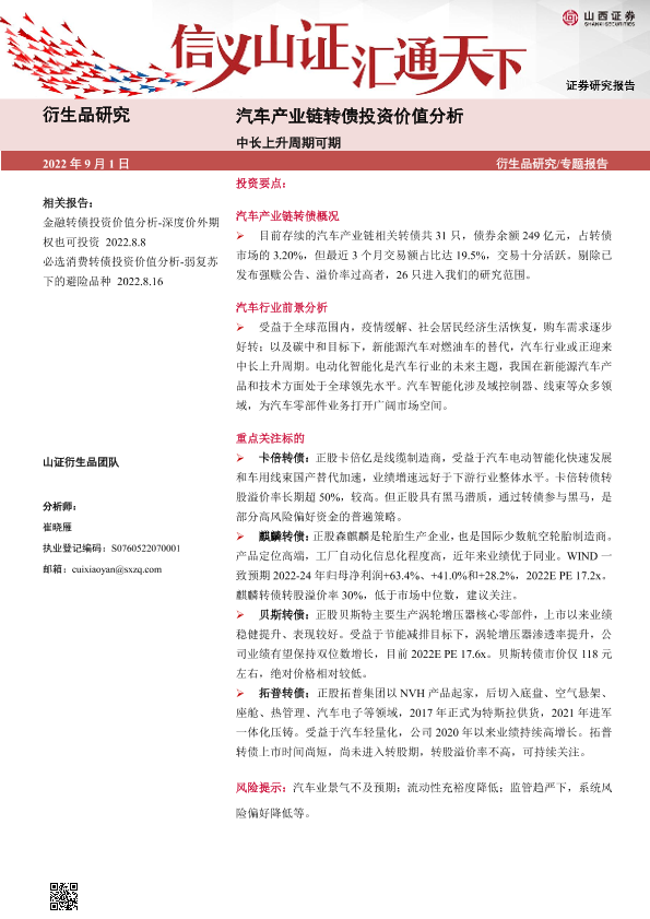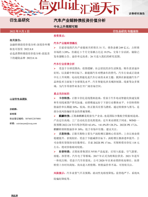 【山西证券】【20220901】汽车产业链转债投资价值分析:中长上升周期可期-32页