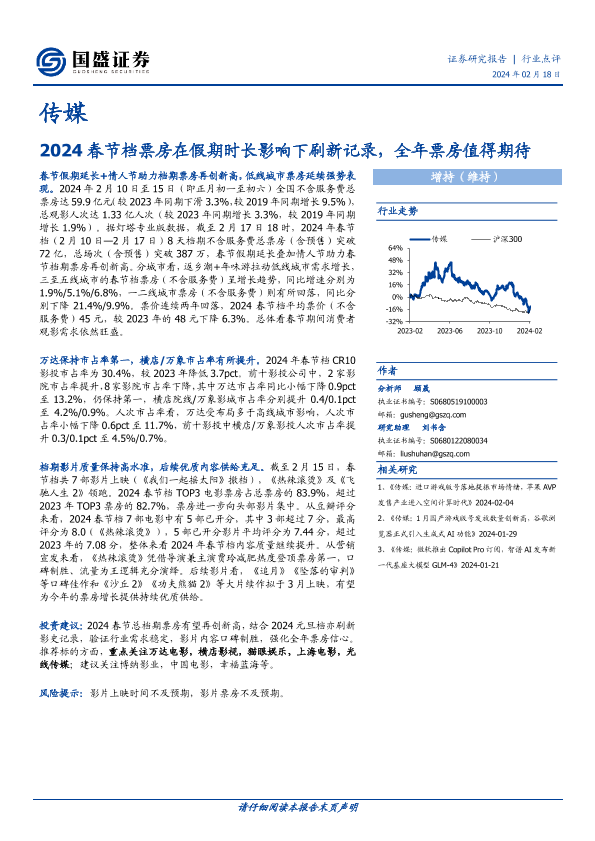 【国盛证券】【20240218】2024春节档票房在假期时长影响下刷新记录,全年票房值得期待-14页