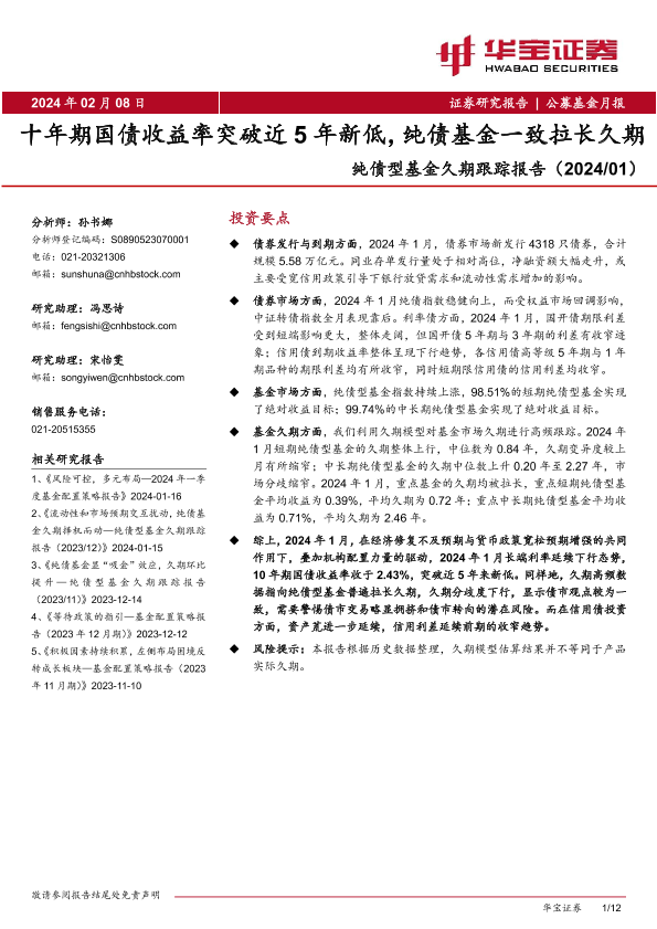 【华宝证券】【20240208】纯债型基金久期跟踪报告(2024 01):十年期国债收益率突破近5年新低,纯债基金一致拉长久期-12页