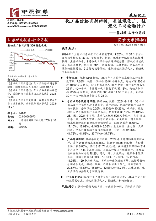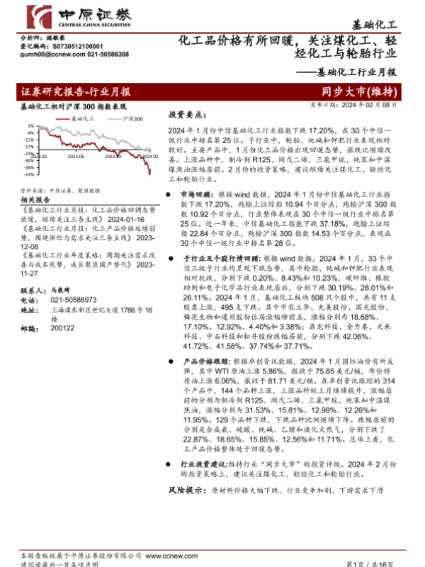 【中原证券】【20240208】基础化工行业月报:化工品价格有所回暖,关注煤化工、轻烃化工与轮胎行业-16页