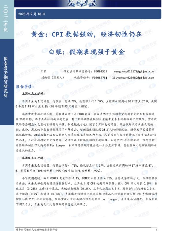 【国泰君安期货】【20240218】黄金:CPI数据强劲,经济韧性仍在 白银:假期表现强于黄金-14页