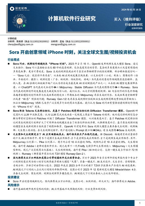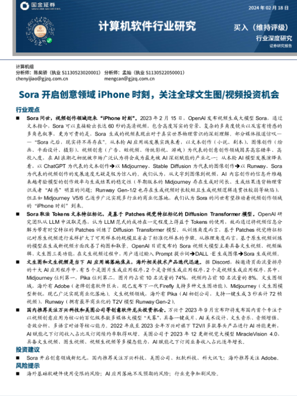 【国金证券】【20240218】计算机软件行业研究:Sora开启创意领域iPhone时刻,关注全球文生图视频投资机会-22页