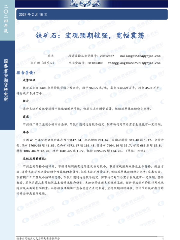 【国泰君安期货】【20240218】铁矿石:宏观预期较强,宽幅震荡-10页