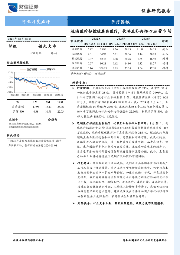 【财信证券】【20240205】医疗器械行业月度点评:迈瑞医疗拟控股惠泰医疗,优势互补共拓心血管市场-12页