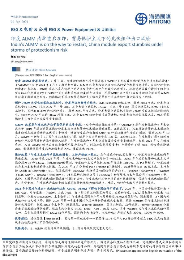 【海通国际】【20240220】印度 ALMM清单重启在即,贸易保护主义下的光伏组件出口风险-10页