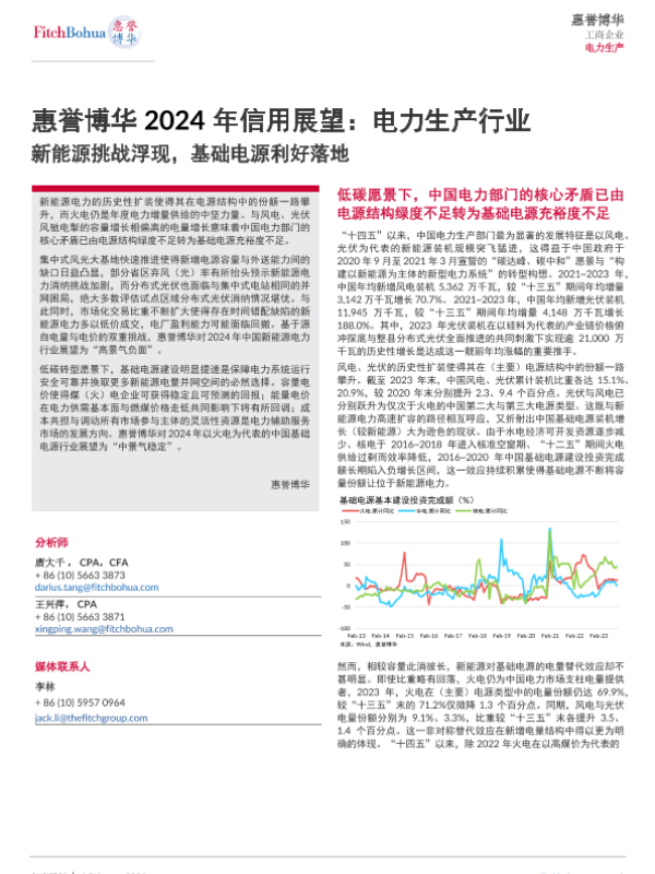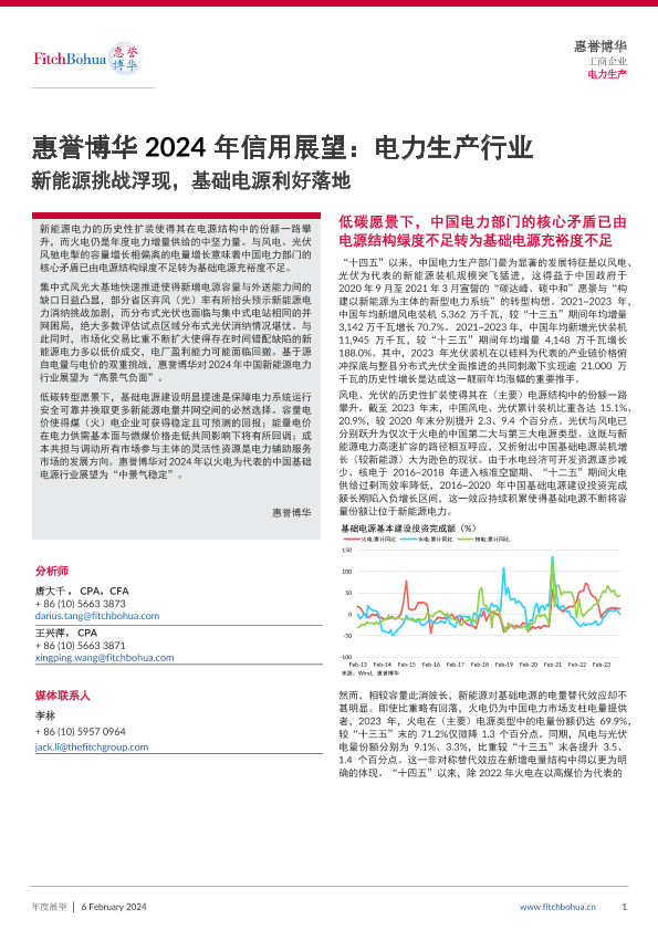 【惠誉博华】【20240206】2024年信用展望:电力生产行业——新能源挑战浮现,基础电源利好落地-10页