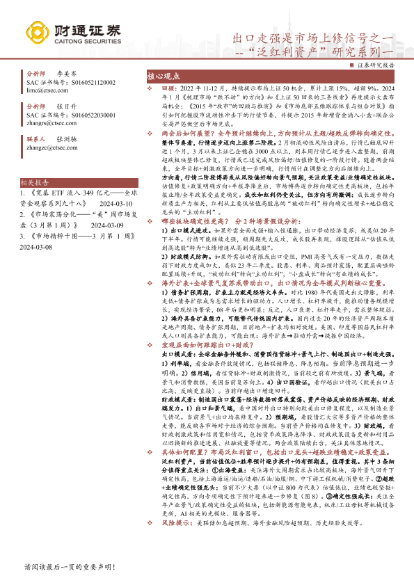 【财通证券】【20240310】“泛红利资产”研究系列一:出口走强是市场上修信号之一-12页