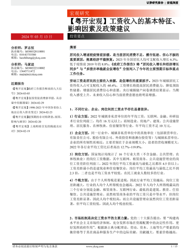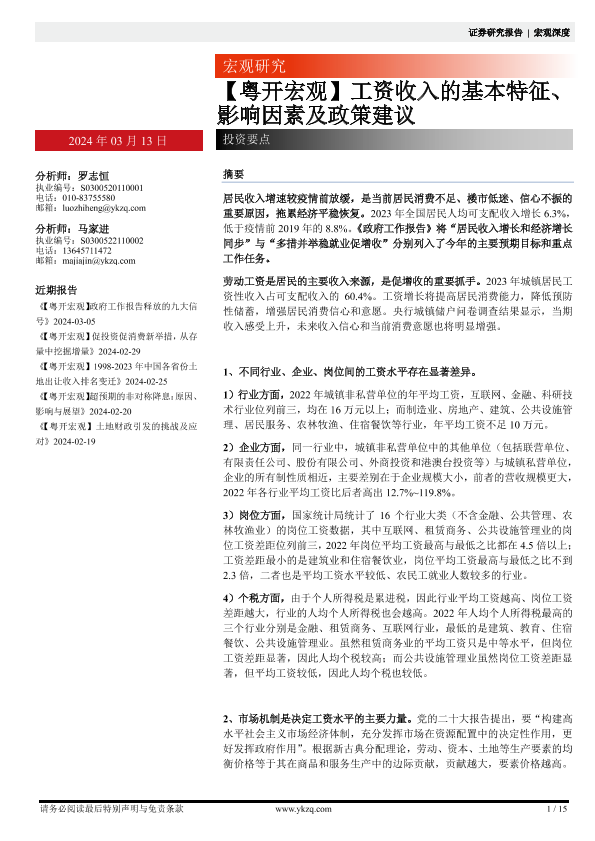 【粤开证券】【20240313】【粤开宏观】工资收入的基本特征、影响因素及政策建议-15页