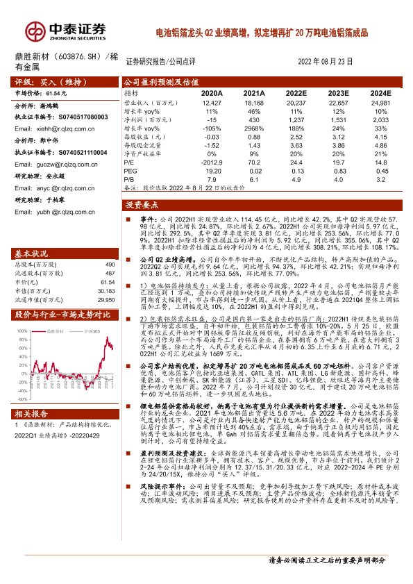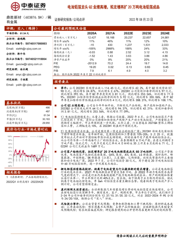 【中泰证券】【20220823】电池铝箔龙头Q2业绩高增,拟定增再扩20万吨电池铝箔成品-5页