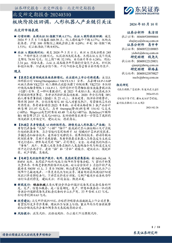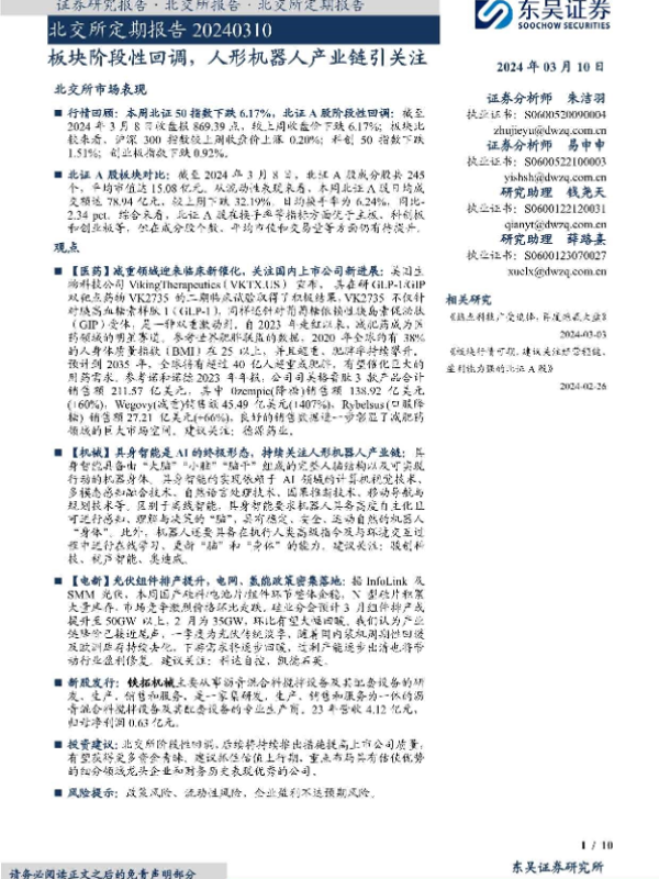 【东吴证券】【20240310】北交所定期报告:板块阶段性回调,人形机器人产业链引关注-10页