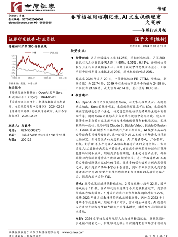 【中原证券】【20240312】传媒行业月报:春节档破同档期纪录,AI文生视频迎重大突破-17页