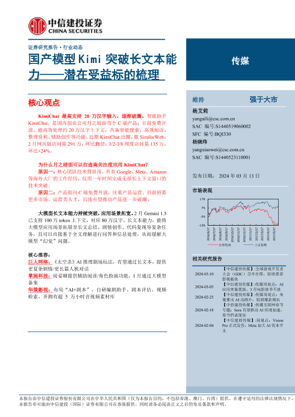 【中信建投证券】【20240313】传媒行业潜在受益标的梳理:国产模型Kimi突破长文本能力-10页