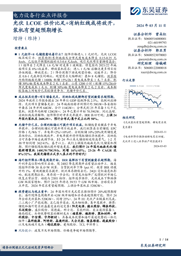 【东吴证券】【20240311】电力设备行业点评报告:光伏LCOE性价比足+消纳红线或将放开,装机有望超预期增长-14页