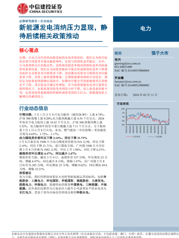 市场表现 政策推动 新能源发电 电力行业 高股息标的