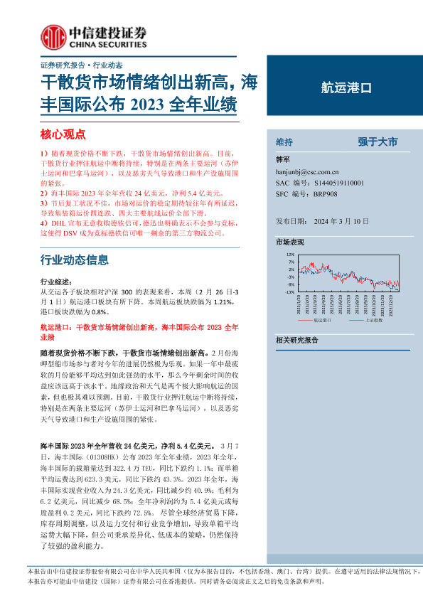 【中信建投证券】【20240310】航运港口行业:干散货市场情绪创出新高,海丰国际公布2023全年业绩-27页