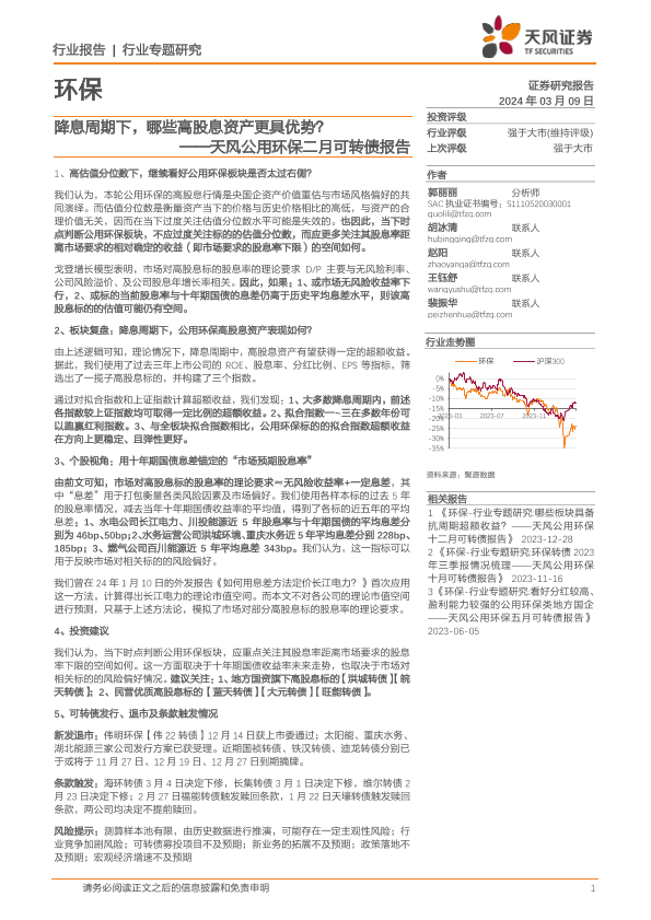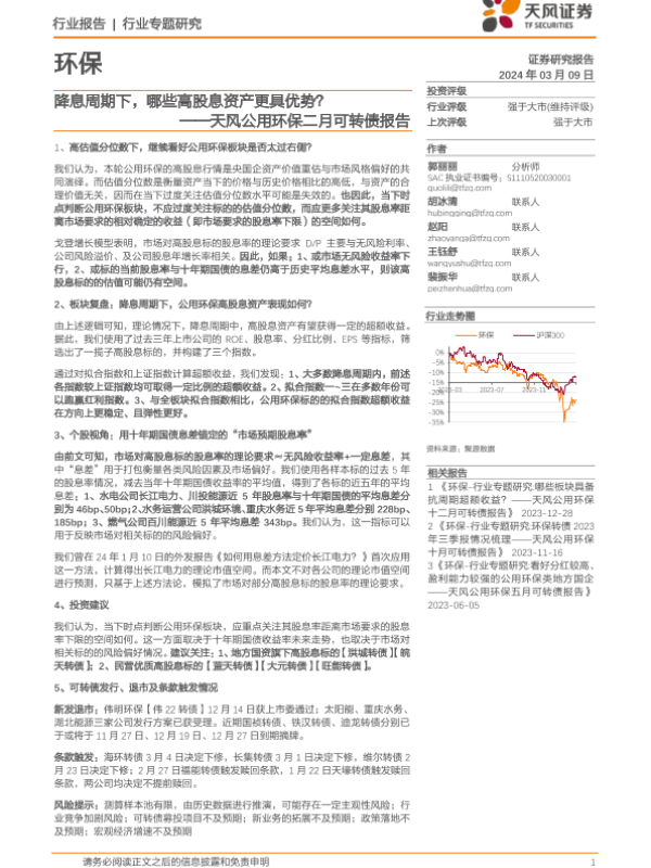 【天风证券】【20240309】环保行业天风公用环保二月可转债报告:降息周期下,哪些高股息资产更具优势?-20页