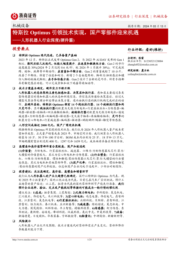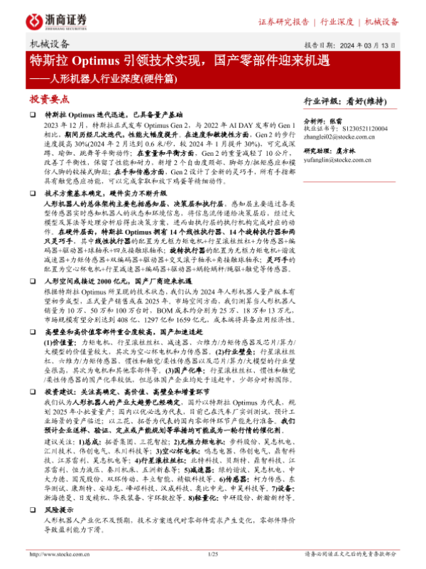 【浙商证券】【20240313】机械设备人形机器人行业深度(硬件篇):特斯拉Optimus引领技术实现,国产零部件迎来机遇-25页