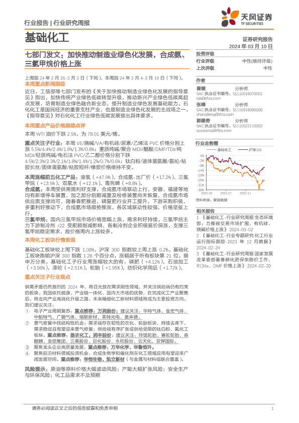【天风证券】【20240310】基础化工行业七天部门发文:加快推动制造业绿色化发展,合成氨、三氯甲烷价格上涨-20页