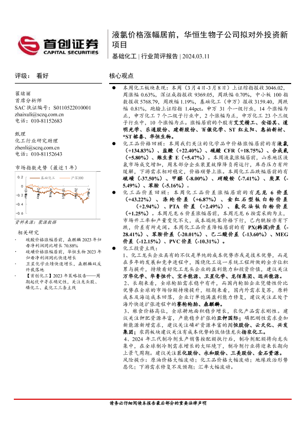 【首创证券】【20240311】基础化工行业简评报告:液氯价格涨幅居前,华恒生物子公司拟对外投资新项目-16页